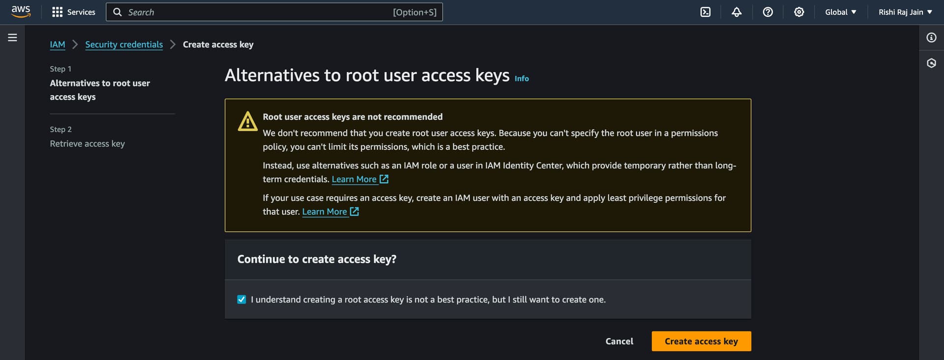 - Scroll down to Access keys and click on Create access key.